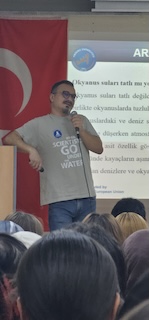 Science in Blue Karaman’da: “Is it getting warmer?” ile Gençler Okyanusların Geleceğini Düşündü!When Scientists Go Under the Water: Science in Blue projesinin Karaman ilindeki ikinci etkinliği, 27 Ekim 2025 Pazartesi günü saat 11.00’de Başakşehir Şehit Hamza Çetin Anadolu Lisesinde gerçekleştirildi. 2009’da yapımına başlanan ve 2010’da eğitim-öğretime açılan okul; 32 derslik, fizik-kimya-biyoloji laboratuvarları, kütüphane, arşiv, rehberlik birimi ve idari odalarıyla güçlü bir eğitim altyapısı sunuyor. Ağaçlandırılmış kampüste voleybol, basketbol ve futbol sahaları bulunuyor; kurum, dört yıllık genel lise eğitimi veriyor.Etkinlik öncesinde Okul Müdürü Ali Koçak, Müdür Yardımcısı Hasan Serdar Macit, Coğrafya Öğretmeni (proje ortağı) Lütfü Yalçıntaş, İngilizce Öğretmeni Mehmet Erkaya, Fizik Öğretmeni Özgür Özel, İl MEM Yenilik ve Eğitim Teknolojileri Şubesinden Hamza Sağcan ve Karaman İl MEM STEM Şubesinden Betül Karabudak ile yapılan toplantıda projenin amaç-hedef-kapsamı aktarıldı; AB destekli referans projeler tanıtıldı ve okul kütüphanesine sualtı kültürel mirası kitapları bağışlandı.Konferans salonundaki sunum, Dr. Çağlar Çakır tarafından “Is it getting warmer?” başlığıyla gerçekleştirildi. Açılışta Dr. Çakır ve Günay Dönmez, öğrencileri sualtı bilimine ve dalışa özendirmek amacıyla kendi “dalışa başlama” hikâyelerini paylaştı. Ardından Science in Blue’nun temel amacı—gençleri geleceğin bilim insanları olmaya teşvik etmek—net biçimde vurgulandı; projeye referans olan AB destekli girişimler ve Mavi Ekonomi kavramı örneklerle açıklandı. Sunumun omurgasında okyanus ve denizlerin giderek ısınması yer aldı: okyanus yüzey sıcaklıklarının uzun dönemli değişimleri grafiklerle gösterildi; nedenler-kanıtlar-sonuçlar çerçevesinde güncel etkiler ve geleceğe dönük zorluklar tartışıldı.Program, öğrencilerin küresel ısınma ve iklim değişikliği, okyanus bilimi, ekibin sualtı çalışmaları ve dalış gibi konulardaki sorularına yanıt bulduğu canlı bir soru-cevap ile derinleşti. Son bölümde etki değerlendirmesi amacıyla anketler dağıtıldı; gün, okul yönetimi, İl MEM temsilcileri ve öğrencilerin yer aldığı toplu fotoğraf ile tamamlandı. Etkinliğe 9. sınıftan 75 öğrenci ve 7 öğretmen katıldı.
