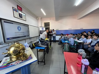 Ovacık Şehit Bayram Aksoy Ortaokulu ve İlkokulu’nda “Sualtında Hızlı ve Güvenli Çalışma” Sunumu ve EtkinliğiOvacık Şehit Bayram Aksoy Ortaokulu ve İlkokulu’nda, AB projesi “Science in Blue” kapsamında, öğrencilerin sualtı çalışmalarında güvenlik ve etkinlik konularını keşfetmelerini amaçlayan özel bir etkinlik gerçekleştirildi. Etkinlik, sualtında görevleri güvenli ve hızlı bir şekilde yürütme yöntemleri ile dalış ekipmanlarının doğru kullanımını tanıtmayı hedefledi.Sunumlar, Galatasaray Üniversitesi’nden Dr. Öğretim Üyesi Tamer Özyiğit ve Boğaziçi Sualtı Araştırma Merkezi’nden Ebru Öksüz tarafından yapıldı. Öğrenciler, dalış sırasında güvenli hareket etmenin yolları, acil durumlarda uygulanabilecek önlemler ve sualtında verimli çalışma teknikleri hakkında bilgiler aldı.Etkinliğe öğretmenler ve Milli Eğitim Müdürlüğü’nden Dilber Acar de katıldı. Öğrenciler, sergide dalış kafeleri, paletler ve diğer dalış ekipmanlarını yakından inceleyip deneme fırsatı buldu.Etkinlik, öğrencilerin sualtı güvenliği ve dalış teknikleri konusunda farkındalık kazanmalarını sağladı ve bilimsel öğrenimlerine katkıda bulundu. Katılımcılar, gelecekte sualtı araştırmalarına güvenli ve bilinçli şekilde katkıda bulunabilecek bireyler olmaya teşvik edildi.
